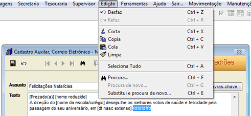 As opções do menu Edição somente estão habilitadas se houver um formulário aberto e estiver selecionado um campo de texto. Mesmo assim é necessário que o operador tenha feito alguma ação que forneça a condição necessária para que a opção correspondente esteja habiitada. De outro modo as opções estarão todas desabilitadas.